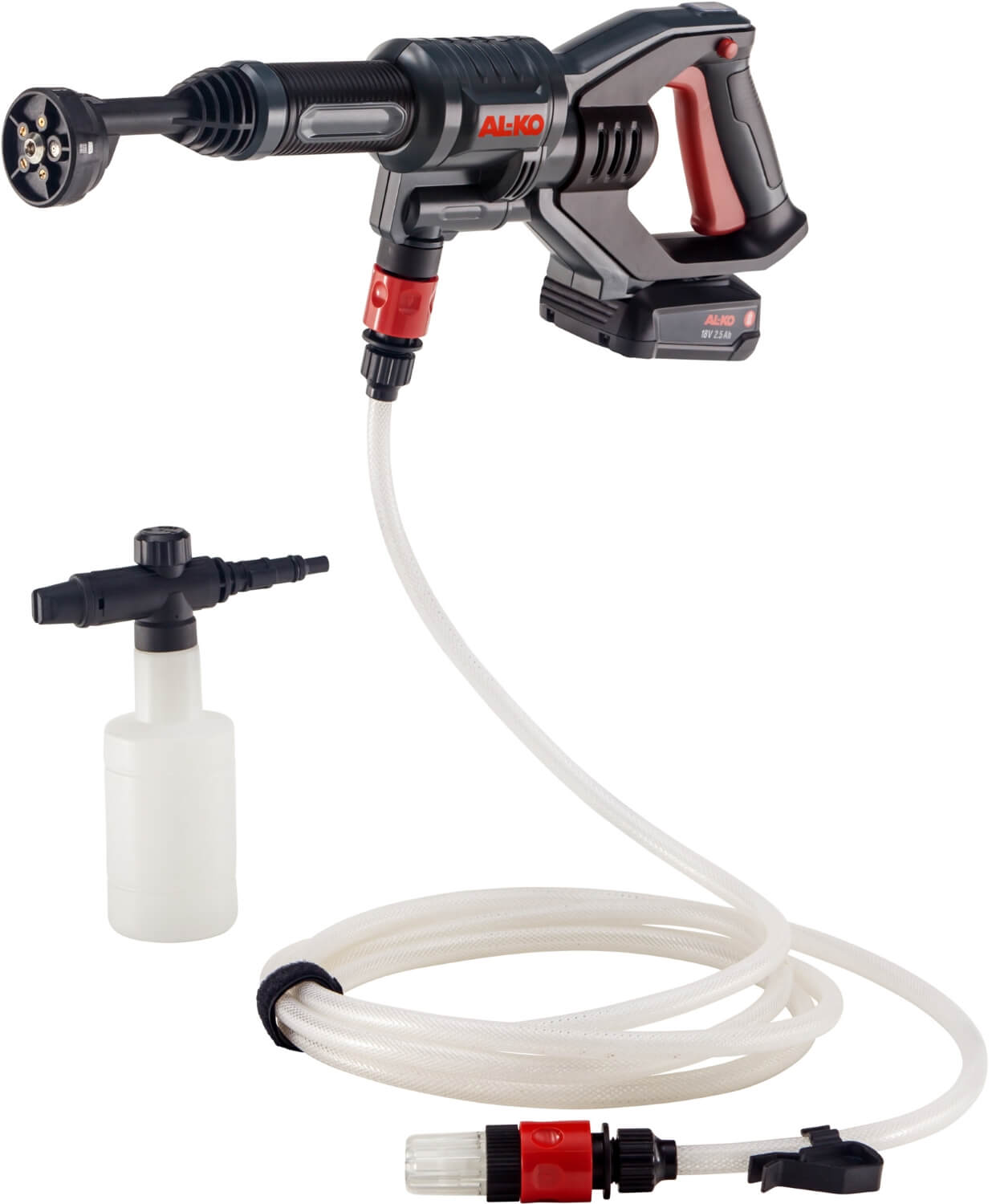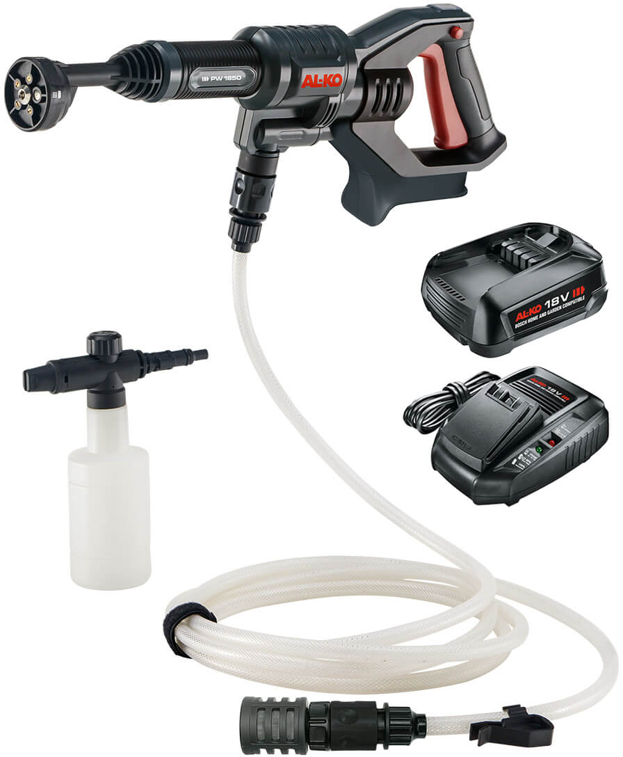 Wysokociśnieniowa myjka to uniwersalne urządzenie akumulatorowe. Dzięki dyszom 5w1 otrzymujemy do dyspozycji 5 trybów pracy, w tym funkcję podlewania roślin. Dodatkowym atutem jest akcesorium w postaci zbiornika na detergent, który umożliwia spienianie podczas czyszczenia. Myjka jest wyposażona w 6 metrowy wąż, który pozwoli na zasysanie wody z bardziej oddalonych źródeł. Myjkę AL-KO PW1850 możemy używać w połączeniu z dowolnym źródłem wody, np. zbiornikiem na deszczówkę czy przyłączem bieżącej wody.