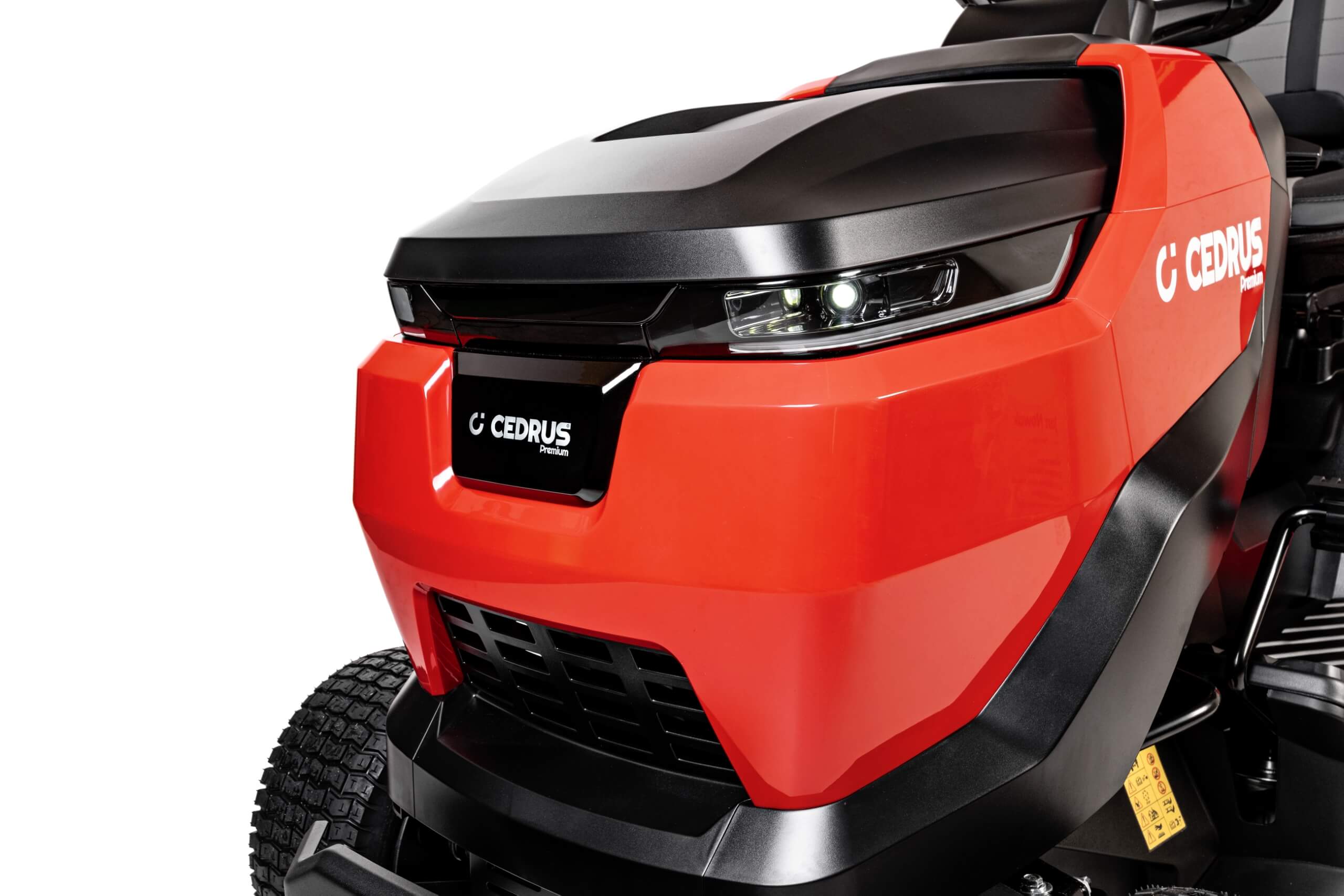 Oświetlenie LED zamontowane z przodu wspomoże pracę, gdy na dworze będzie już zbyt ciemno. Można je aktywować ręcznie, lub też ustawić tryb automatyczny, a wbudowany czujnik zmierzchu samodzielnie włączy światła, gdy zapadnie zmrok. Dodatkowym atutem jest uchwyt na kubek oraz schowek, co pozwoli odłożyć na bok najbardziej potrzebne rzeczy. Wygodny fotel z podłokietnikami zapewni komfort podczas długich sesji koszenia. Ponadto traktor posiada w zestawie różne akcesoria – zderzak, wkładka mulczująca, ładowarka do akumulatora, czy też zaczep przyczepki – co niweluje dodatkowe koszty.