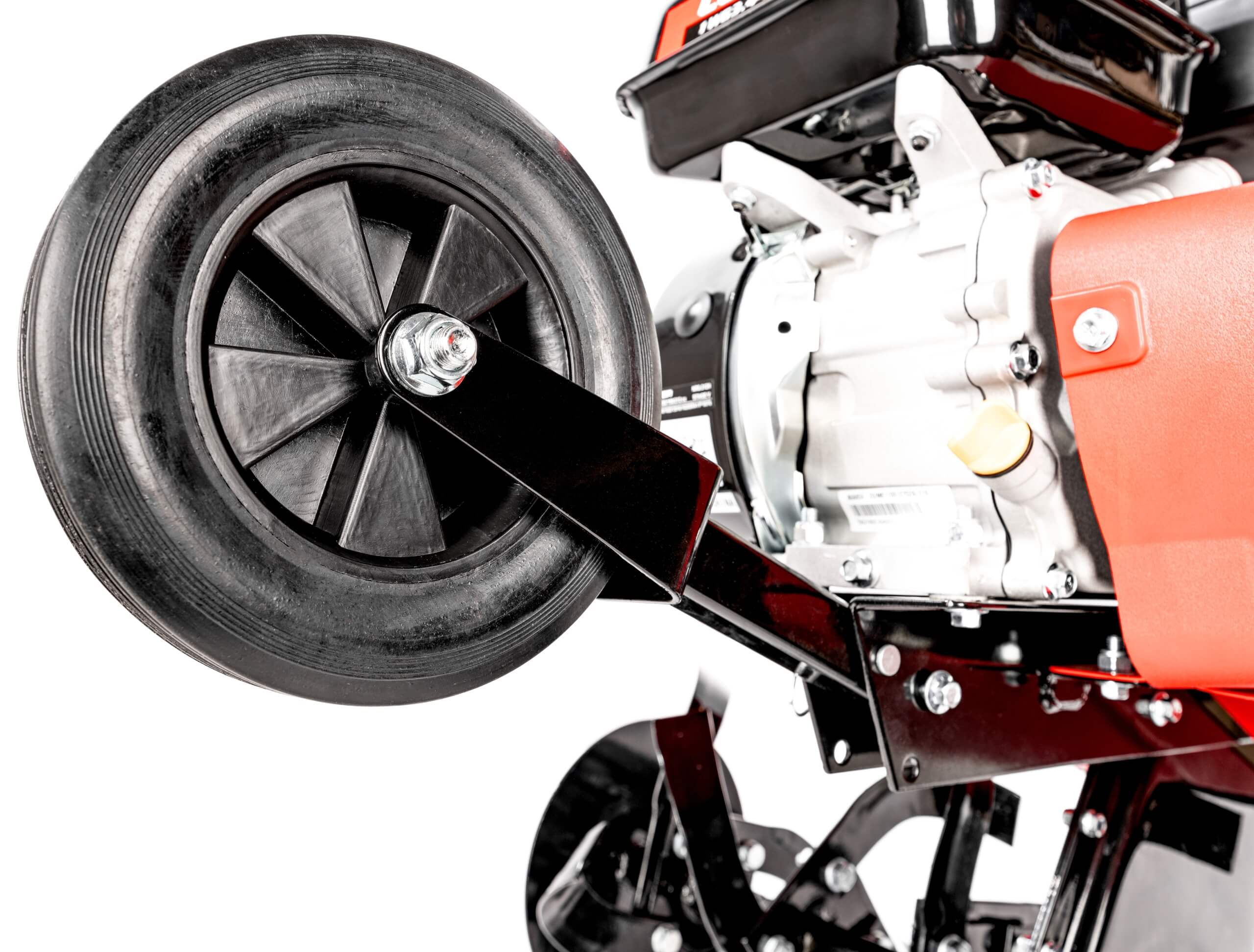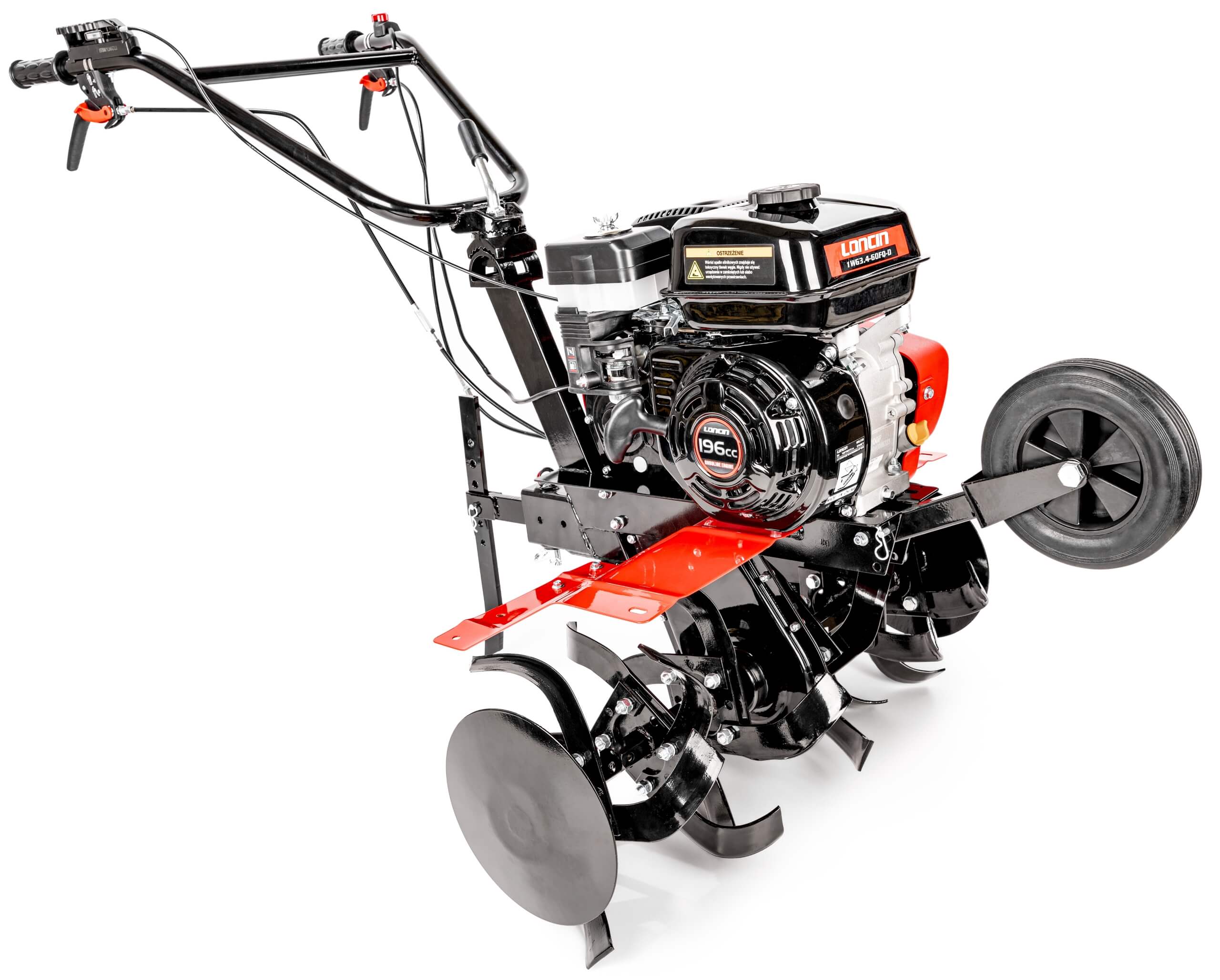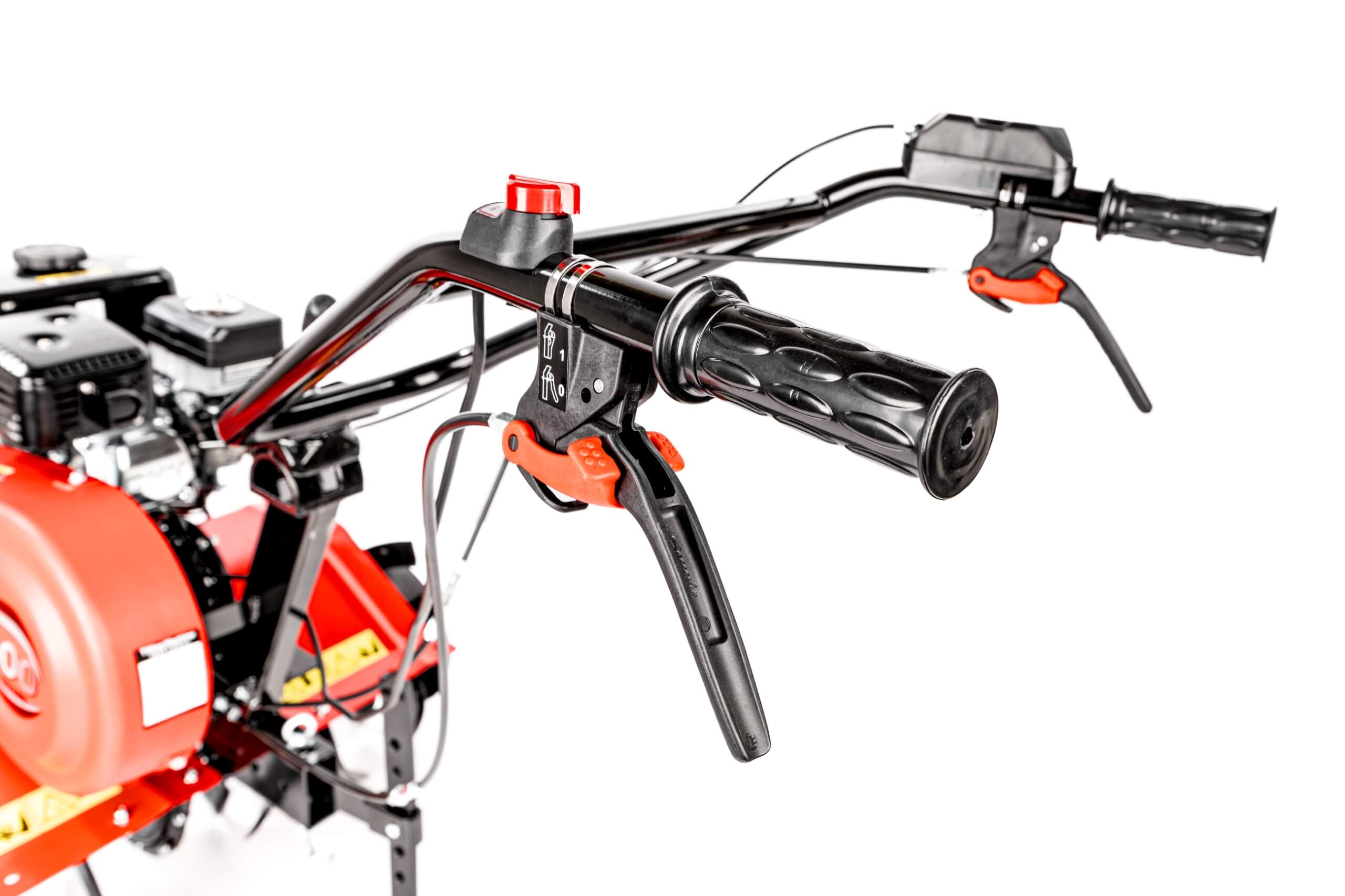 Urządzenie można bez problemu dostosować do użytkownika – zapewnia to regulowany uchwyt – dzięki czemu praca z glebogryzarką będzie wygodna. Przy kierownicy znajdziemy również potrzebne elementy sterujące. Glebogryzarkę Loncin L82 wyposażono w skrzynię, która oferuje 1 bieg do przodu oraz 1 do tyłu. Niewątpliwie zaletą jest koło transportowe, które ułatwia manewrowanie maszyną oraz przewóz do miejsca pracy.